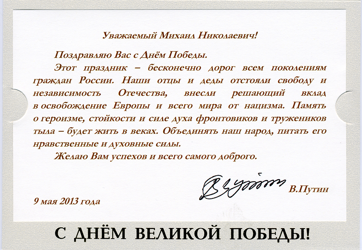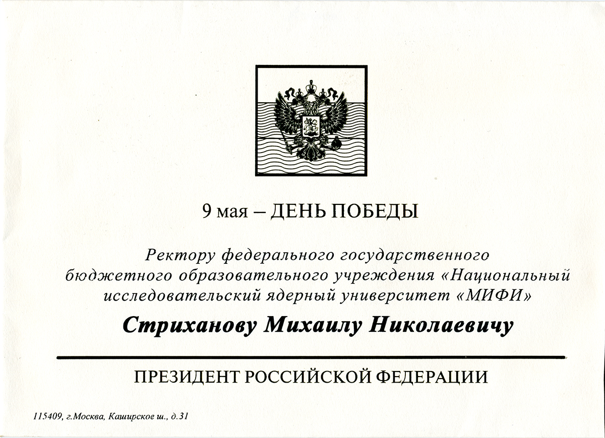 Поздравления с Днем Победы от Президента РФ Путина В.В. в адрес НИЯУ МИФИ