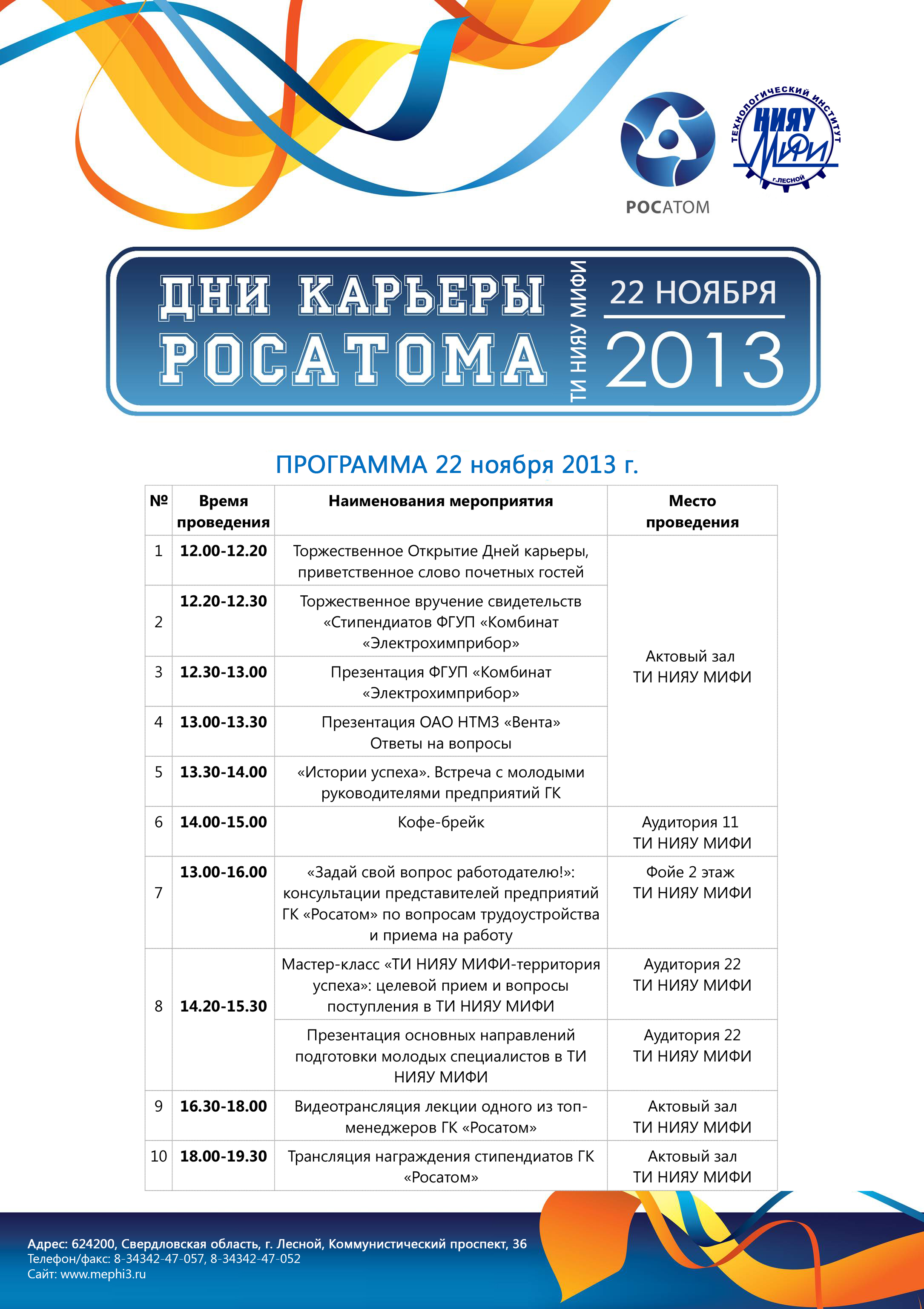 22 ноября 2013 г. (пятница) Технологический институт – филиал НИЯУ МИФИ приглашает старшеклассников и их родителей, студентов всех форм обучения, а также всех желающих принять участие в Днях карьеры Росатома.
