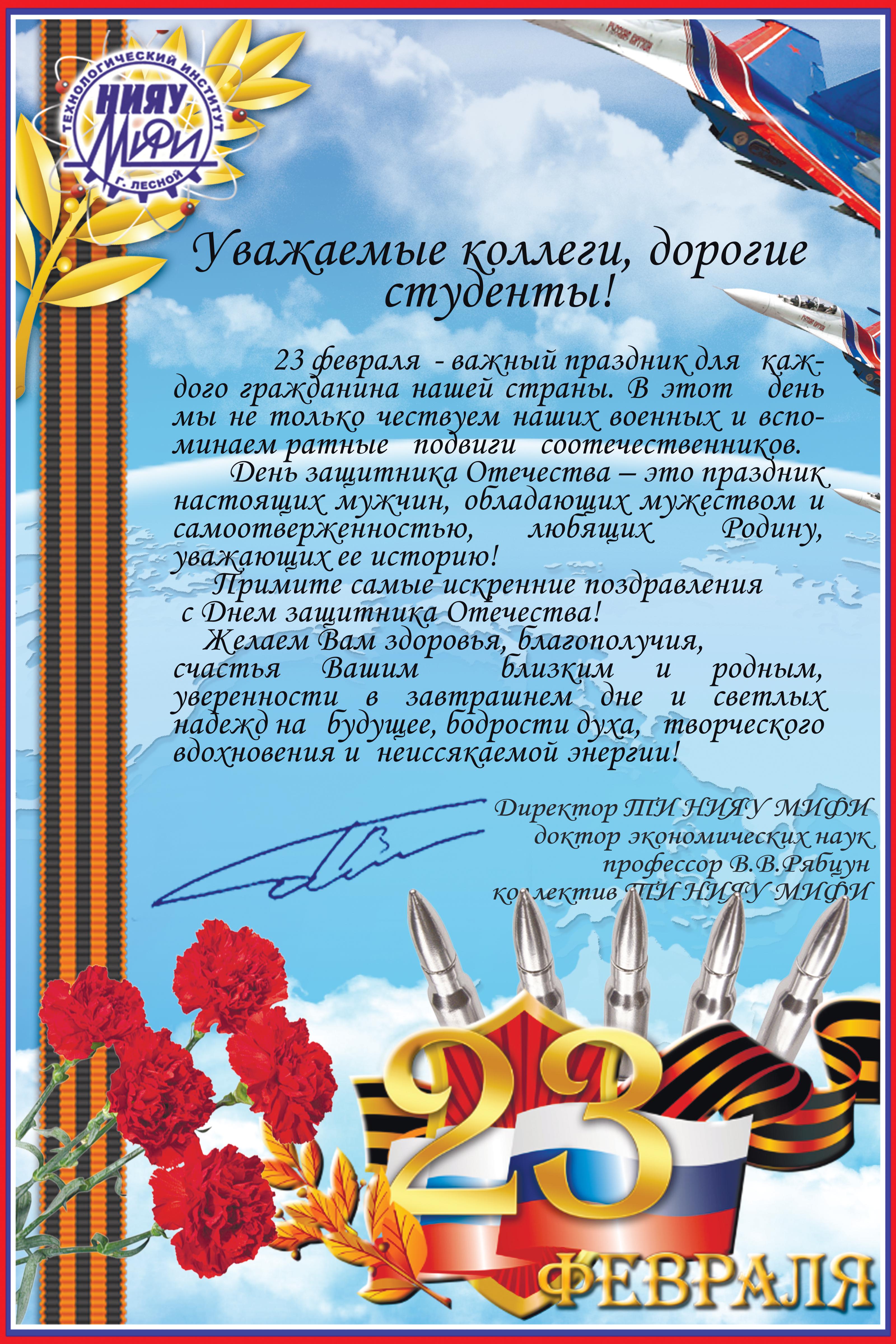 Поздравление директора ТИ НИЯУ МИФИ с Днем защитника Отечества!