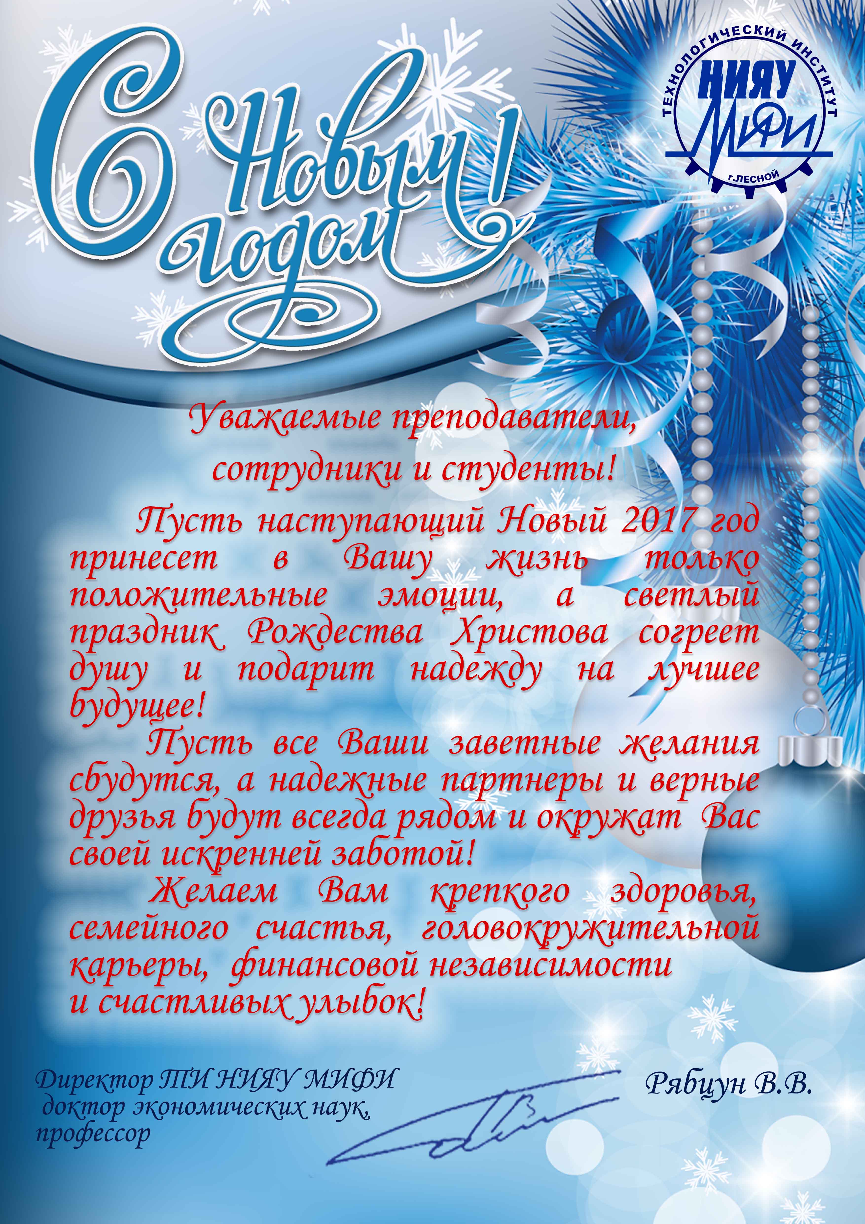 Дата написания: 30.12.2016 Поздравление директора ТИ НИЯУ МИФИ В.В. Рябцуна с Новым годом и Рождеством