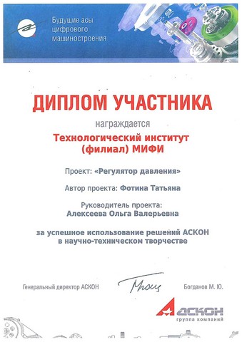 — «Регулятор давления» Фотиной Татьяны, студентки группы КТО-35Д;
