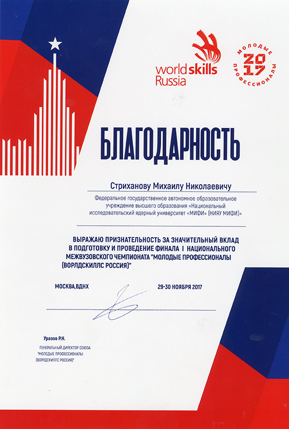 Дата написания: 17.01.2018 Благодарность в адрес НИЯУ МИФИ от генерального директора Союза ‘Молодые профессионалы (Ворлдскиллс Россия)’ Р.Н. Уразова