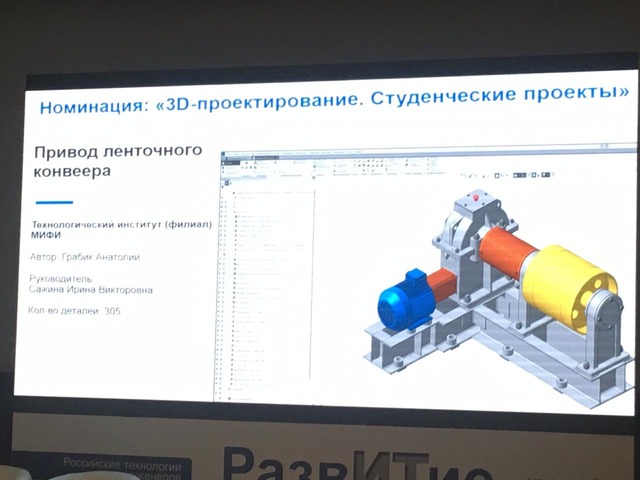 На форуме были награждены победители конкурса «Будущие асы цифрового машиностроения 2018», в их числе студенты Технологического института МИФИ группы КТО-45Д Сокерина Ольга (руководитель — старший преподаватель кафедры технология машиностроения Л.Д.Шмелева) — II место в номинациях «Технологические процессы изготовления деталей или сборочных единиц, созданные в САПР ТП ВЕРТИКАЛЬ» и Грабик Анатолий (руководитель — старший преподаватель кафедры технология машиностроения И.В. Сажина) — III место в номинации «3D-проектирование. Студенческие проекты».