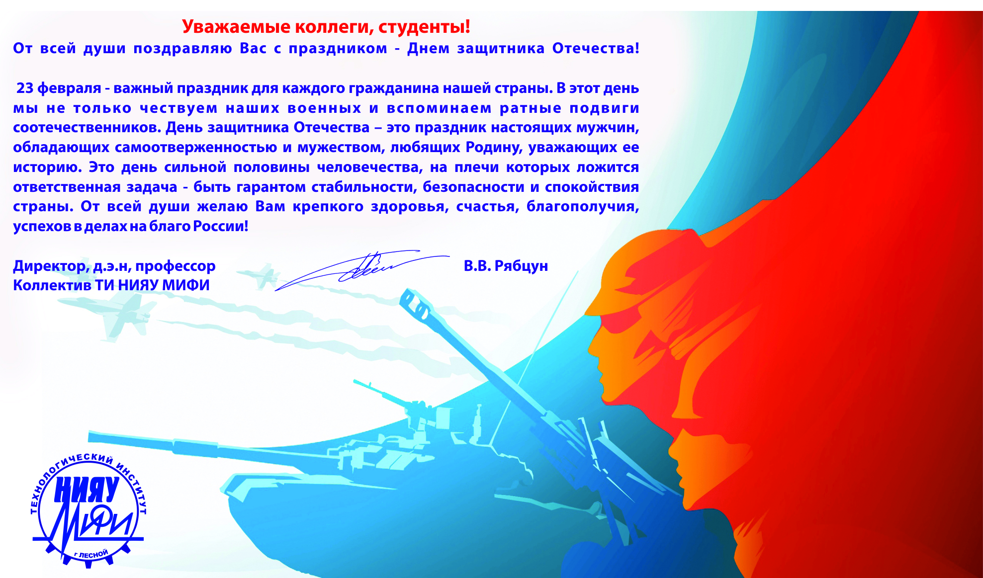 Дата написания: 22.02.2019 Поздравление директора ТИ НИЯУ МИФИ В.В. Рябцуна с Днем Защитника Отечества!