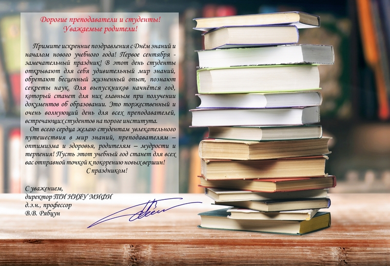 Дата написания: 01.09.2019 Поздравление директора ТИ НИЯУ МИФИ В.В. Рябцуна с Днем знаний Поздравление директора ТИ НИЯУ МИФИ В.В. Рябцуна с Днем знаний