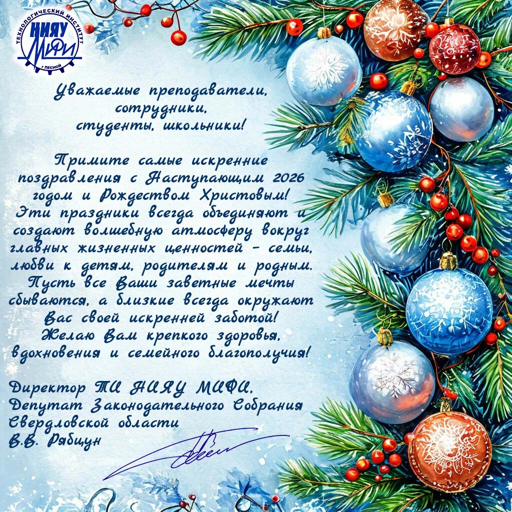Дата написания: 30.12.2025 Поздравление с Новым 2026 годом и Рождеством от директора ТИ НИЯУ МИФИ, Депутата Законодательного Собрания Свердловской области Владимира Васильевича Рябцуна!