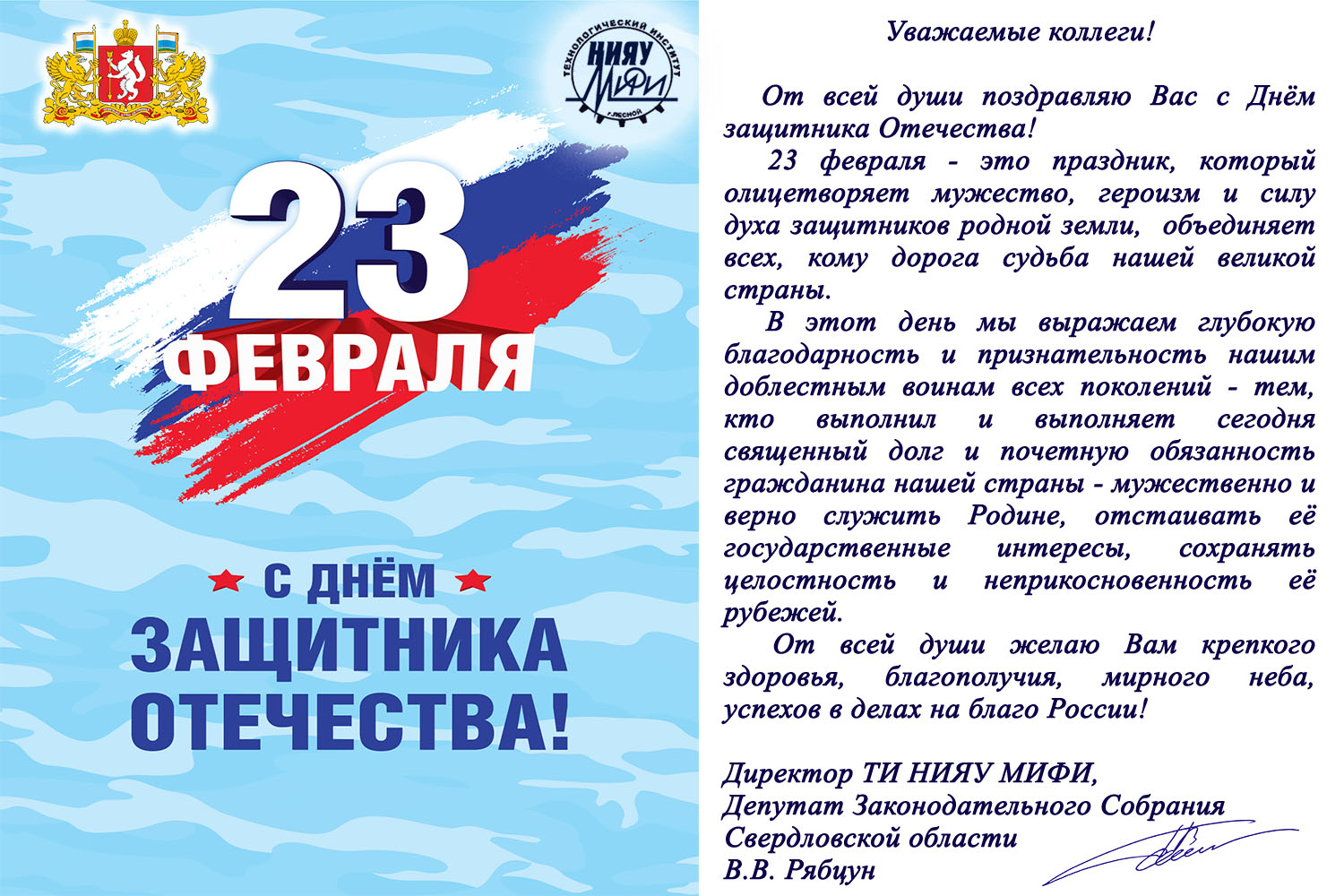Дата написания: 20.02.2026 Поздравление директора ТИ НИЯУ МИФИ В.В. Рябцуна с Днём защитника Отечества