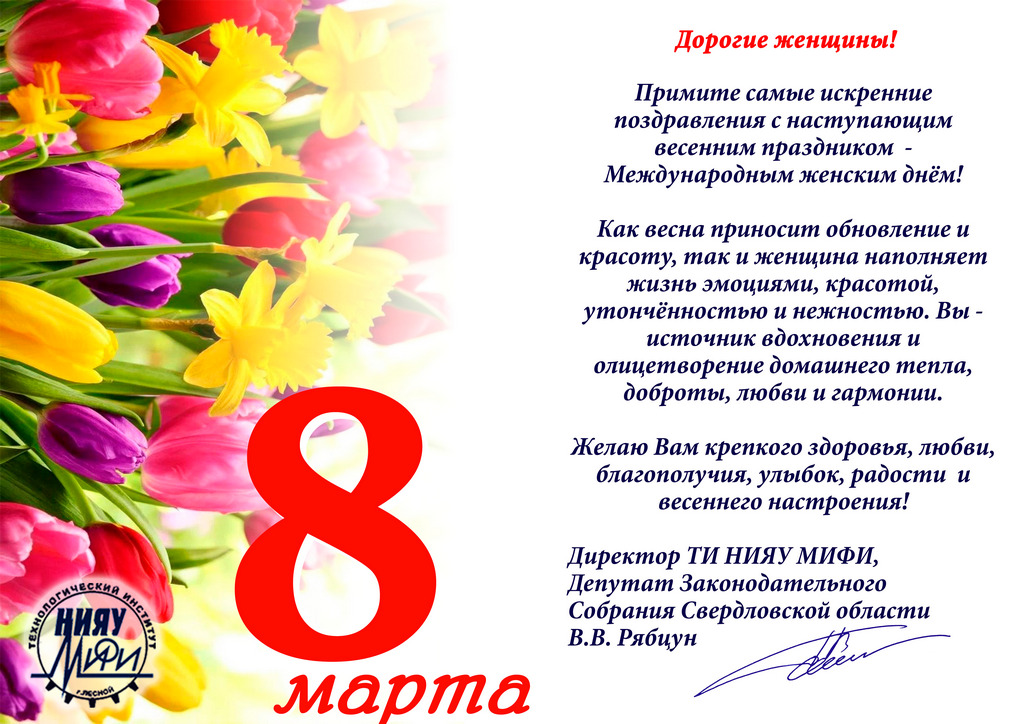 Дата написания: 06.03.2026 Поздравление директора ТИ НИЯУ МИФИ В.В. Рябцуна с Международным женским днём