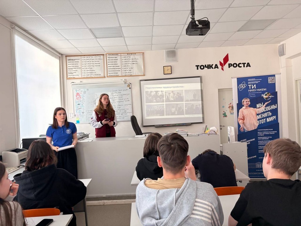 Лопатин Константин и Константинова Маргарита, представляющие молодёжную общественную организацию Комбината «Электрохимприбор», проинформировали учащихся о сотрудничестве Комбината с Технологическим институтом: совместных научных инициативах, мероприятиях и перспективах трудоустройства выпускников.