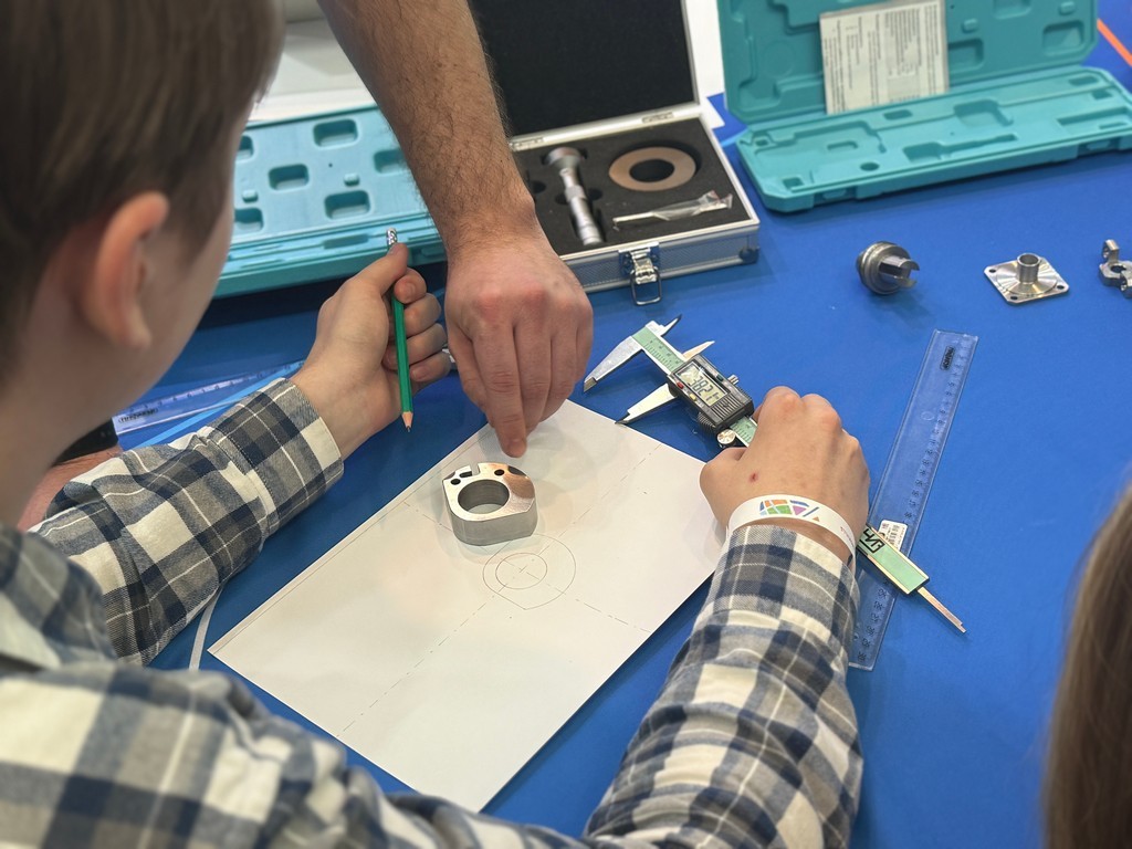 Школьники Екатеринбурга с неподдельным интересом включились в работу. Кто-то впервые в жизни взял в руки штангенциркуль, кто-то уже уверенно снимал размеры и переносил их на бумагу, сверяясь с подсказками сотрудников и студентов-наставников. В ходе мастер-класса школьники научились правильно пользоваться измерительным инструментом, грамотно проставлять размеры и точно изображать элементы различных деталей на чертеже.